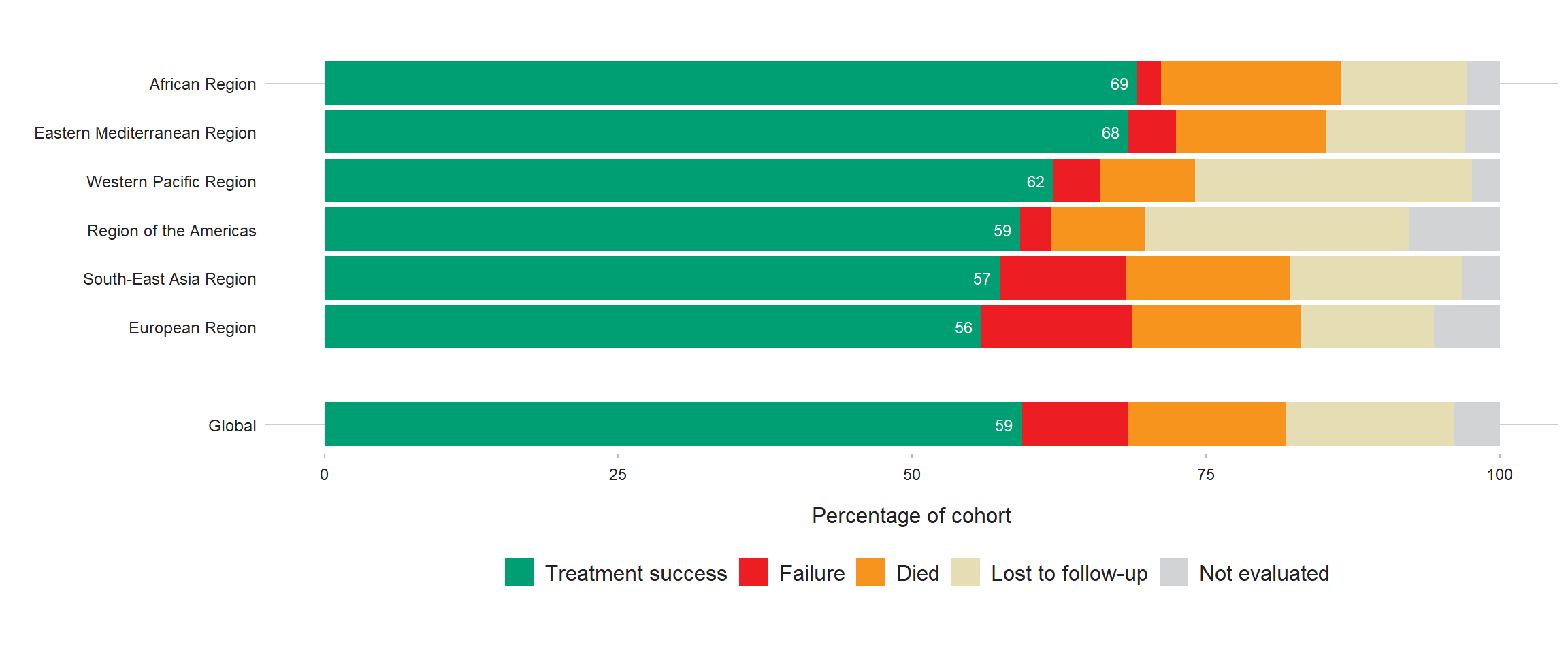 Globally in 2018 (the latest patient cohort for which data are available), the treatment success rate for people treated for MDR/RR-TB with second-line regimens was 59%; this has improved steadily in recent years, from 50% in 2012 (Fig. 3.4.4). Among WHO regions, the treatment success rate in 2018 ranged from 56% in the European Region to 69% in the African Region (Fig. 3.4.5).